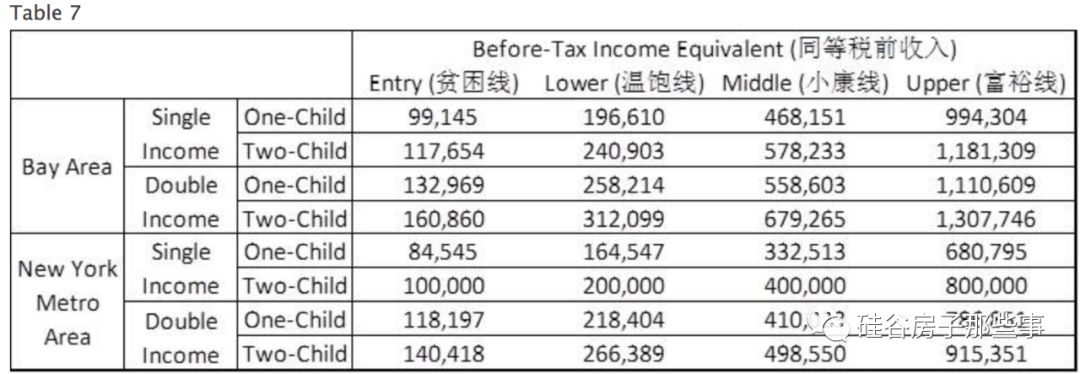 具体怎么读, 举个例子. 纽约单收入单娃的温饱线是164,547, 而湾区双收入双娃达到相应生活水平需要312,099左右, 以此类推. 所以湾区三十万贫困线名不虚传, 不过我这里改个更friendly的名字温饱线, 称谓不要纠结. 而隔壁一贴湾区双收入一娃家庭50万, 的确没到55万八的小康线, 而那位楼主的生活追求直逼富裕线, 压力大是难免的, 大家请理解.