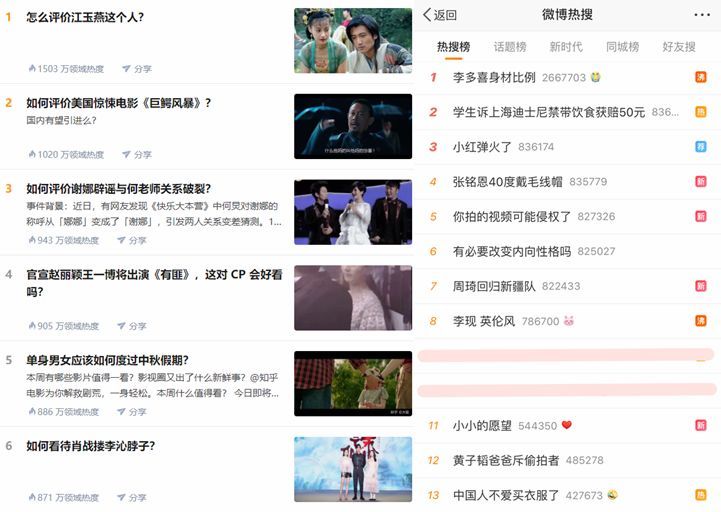微博、知乎等平台,每隔10分钟就有新的热点上榜。图/新浪微博、知乎截图