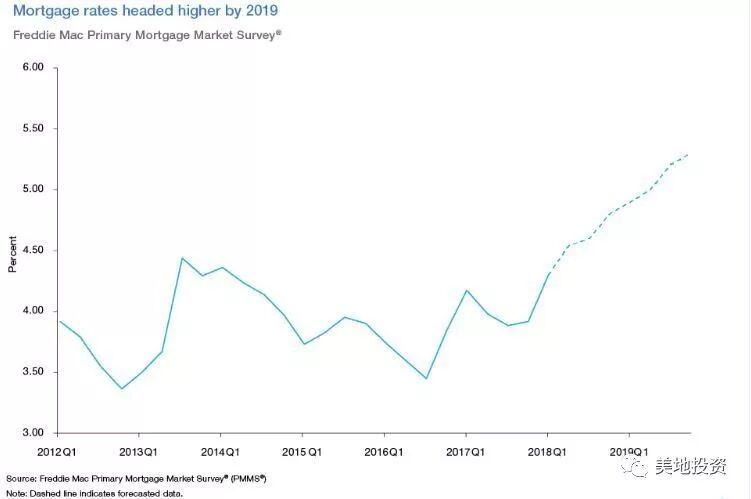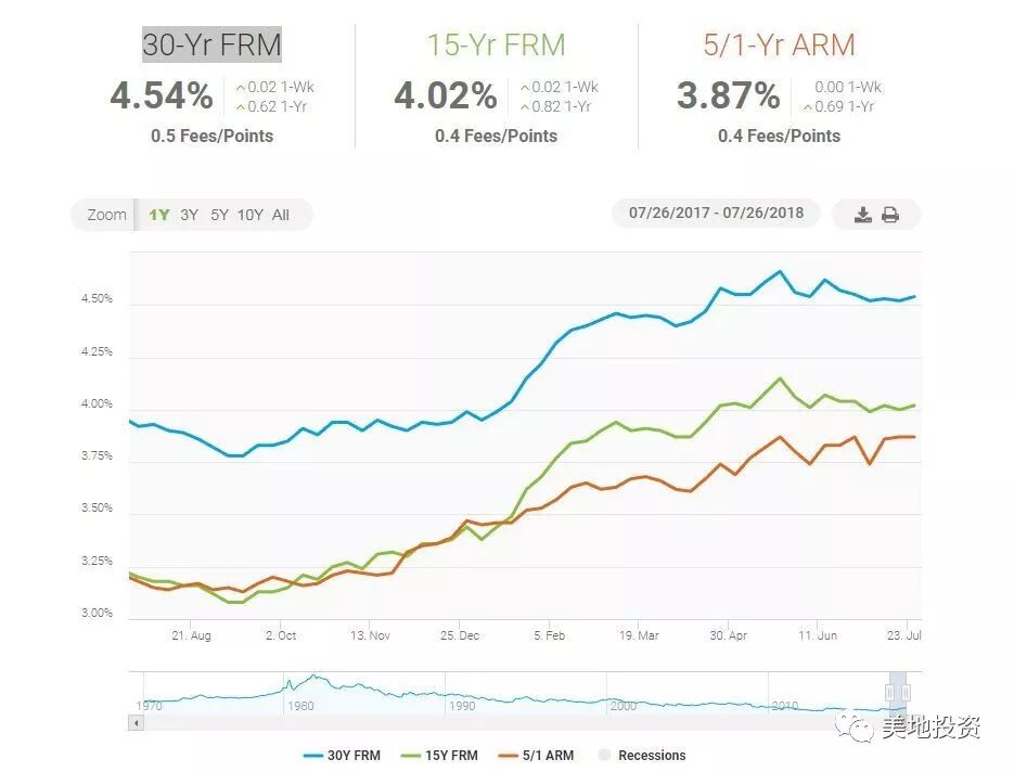根据房地美 (Freddie Mac) 公布的最新数据显示,2018年7月,美国30年期固定贷款抵押利率为4.54%;15年期固定贷款抵押利率为4.02%,5年期浮动贷款抵押利率为3.87%。