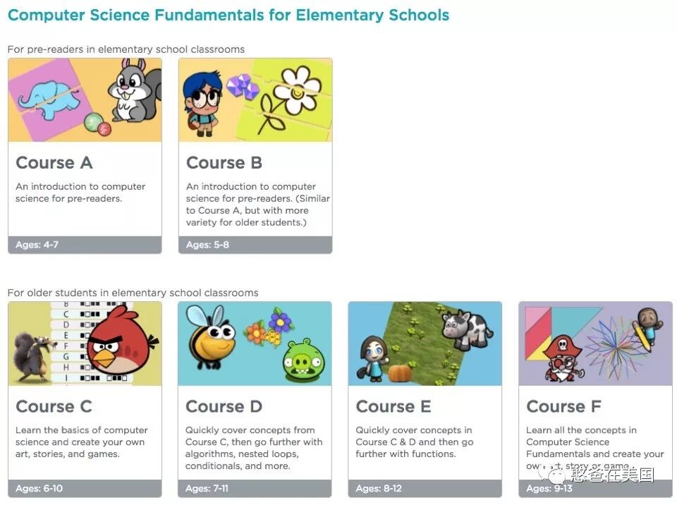 父母可以根据孩子的年龄选择课程,比如我选的是 K-5 的课程,因此出现的就是下面这个界面。在这个课程里,孩子的进度是循序渐进的,你看从 Course A 一直进阶到 Course F,
