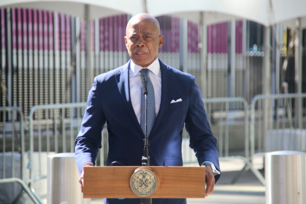 纽约市长亚当斯在记者会上发言,资料图